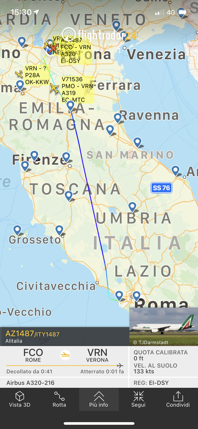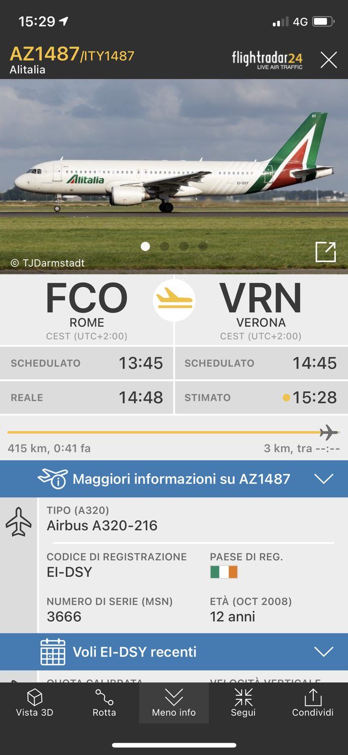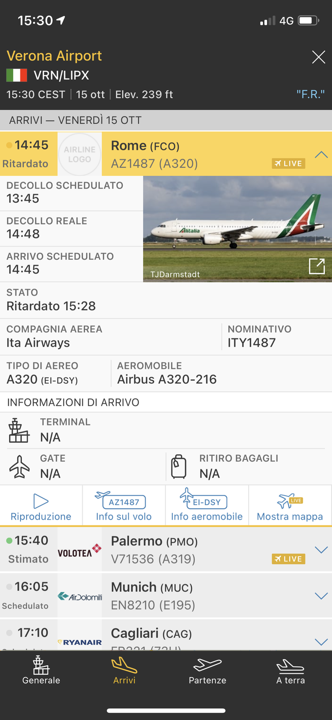 ITA Airways, nata dalle ceneri di Alitalia, ha effettuato ieri 15 ottobre il suo primo volo da Roma a Verona. La tratta è stata effettuata dall'Airbus A320-216 EI-DSY, ancora in livrea Alitalia, che è atterrato a Verona alle 15.28 con 45 minuti circa di ritardo, ripartendo poi per Roma poco dopo le 16.