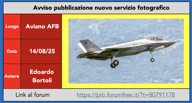 Report · 18. agosto 2025 PSC in trasferta - Aviano AFB Servizio completo al seguente link: https://piti.forumfree.it/?t=80791178 tagPlaceholderTag: forum Scrivi commento Commenti: 1 #1 Edo (lunedì, 18 agosto 2025 19:24) Una mattinata eccezionale! PSC’era!