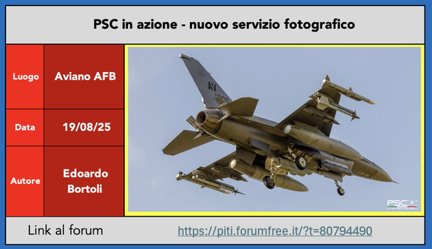 Report · 22. agosto 2025 PSC in azione: Aviano AFB Nuovo reportage di Edoardo Bortoli da Aviano, tra tagli arditi e foto insolite. Link al forum: https://piti.forumfree.it/?t=80794490 tagPlaceholderTag: forum, report Scrivi commento Commenti: 0
