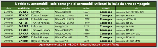 Sono ancora Ryanair e Wizz Air a dominare lo scenario delle prossime consegne di nuovi aeromobili. Interessante anche la coppia di 321neo di Jet2 e il gruppo di 320neo di British Airways che dovrebbero concludere l'iter di consegna entro la metà di settembre. Tra i 321 di Wizz Air è presenta anche un "XRL", identificabile con "Y" nella parte finale del codice modello.