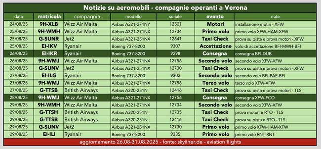 Da oggi integriamo la nostra tabella dedicata all'Aeroporto di Verona con una, riservata alle sole consegne, che ha come ambito di applicazione tutti gli aeromobili potenzialmente osservabili negli aeroporti italiani.