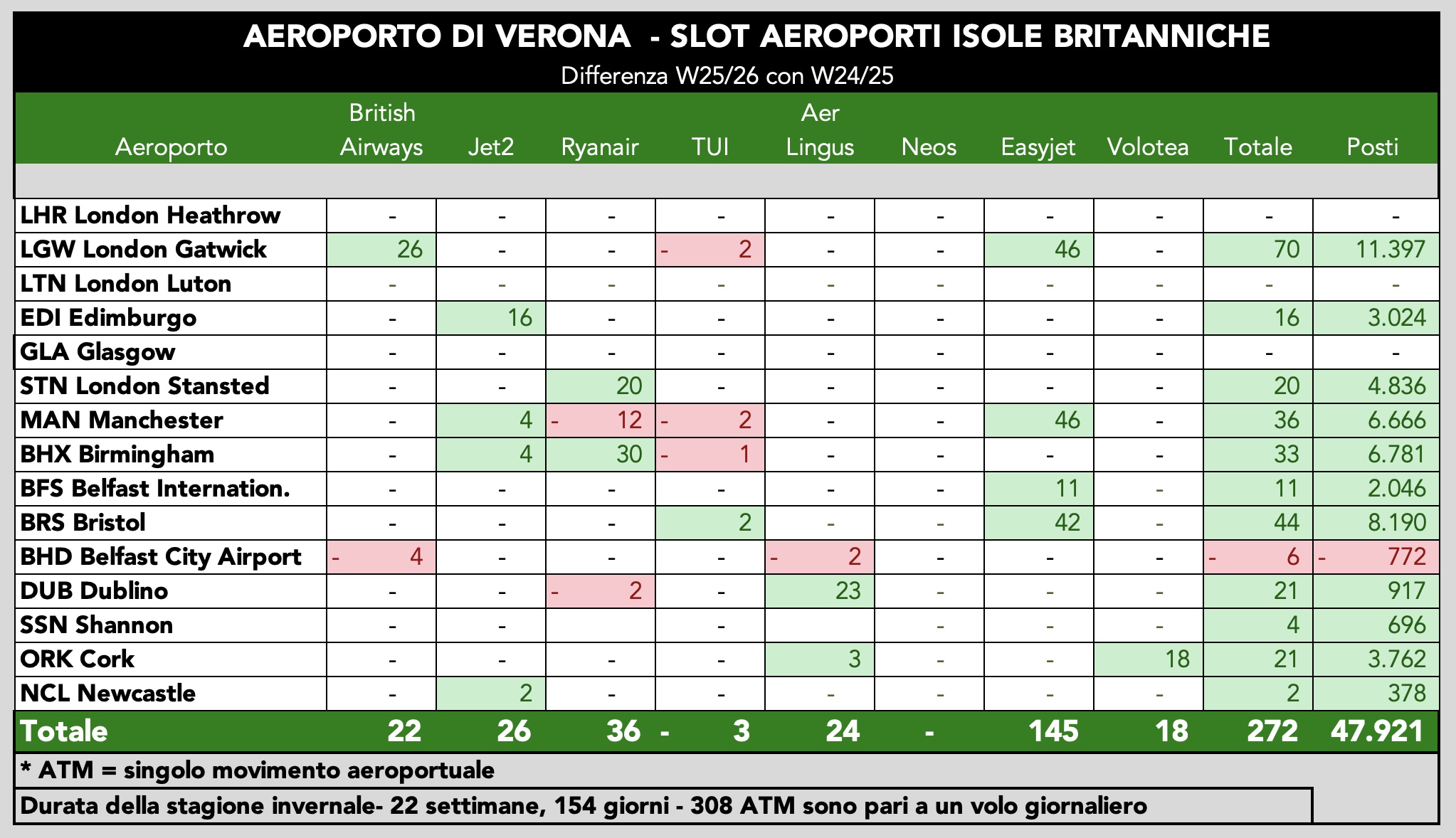 Nell'inverno 2025-2026I movimenti degli aeromobili saranno quindi 272 in più rispetto allo scorso inverno, equivalenti a circa 48mila posti in vendita in più. Il maggiore incremento è in casa easyJet che, grazie al lancio delle rotte su Manchester e Bristol e un sensibile aumento su London Gatwick aumenterà la sua presenza con 145 voli in più. Per quanto riguarda gli aeroporti, invece, sempre London Gatwick avrà un aumento di 70 movimenti, seguito da Bristol con 44 e Manchester con 36.