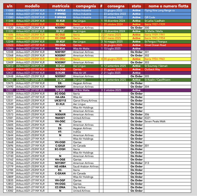 Concludiamo, come già accennato, con un riepilogo della situazione delle consegne dell'Airbus A321neo XRL, considerato non a torto come il vero protagonista della storia dell'aviazione commerciale dei prossimi dieci anni.