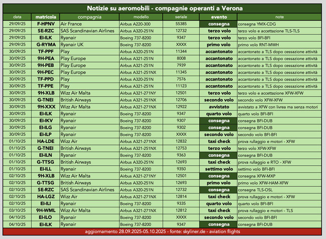Nell'ultima settimana sono stati consegnati quattro Boeing 737-8 MAX, tutti a Ryanair, e tre Airbus, tra i quali un A321neo a Wizz Air nella versione XRL (A321-271NY). Per il gruppo Wizz si tratta del terzo esemplare del modello, come riassunto nella tabella pubblicata in coda all'articolo.