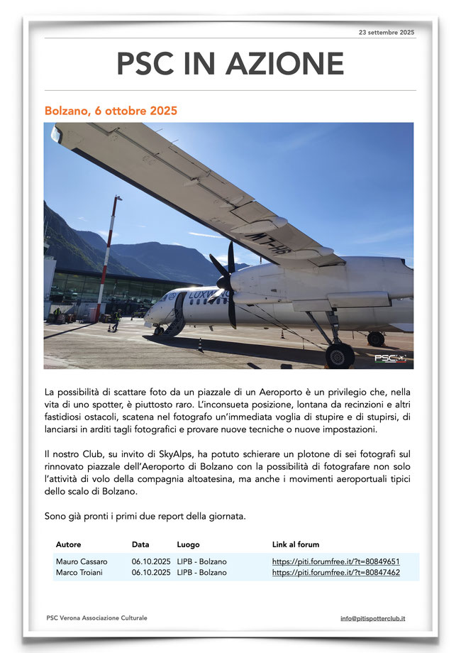 Il nostro Club, su invito di SkyAlps, ha potuto schierare un plotone di sei fotografi sul rinnovato piazzale dell’Aeroporto di Bolzano con la possibilità di fotografare non solo l’attività di volo della compagnia altoatesina, ma anche i movimenti aeroportuali tipici dello scalo di Bolzano.