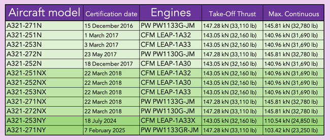 Tra i numeri di modello, il numero "5" (ad esempio, A321-251N) indica gli aeromobili con motore CFM International LEAP-1A, mentre il numero "7" (ad esempio, A321-271N) indica gli aeromobili con motore Pratt & Whitney PW1100G. L'ultima cifra "1" (ad esempio, A321-251NX) indica le opzioni del motore "baseline" e "a spinta standard", l'ultima cifra "2" (ad esempio, A321-252NX) indica le opzioni del motore "declassate", ovvero i motori sono configurati per funzionare con una spinta leggermente inferiore rispetto alle opzioni standard, e l'ultima cifra "3" (ad esempio, A321-253NX) indica le opzioni del motore "aggiornate", ovvero i motori sono configurati per funzionare con una spinta maggiore rispetto alle controparti baseline.