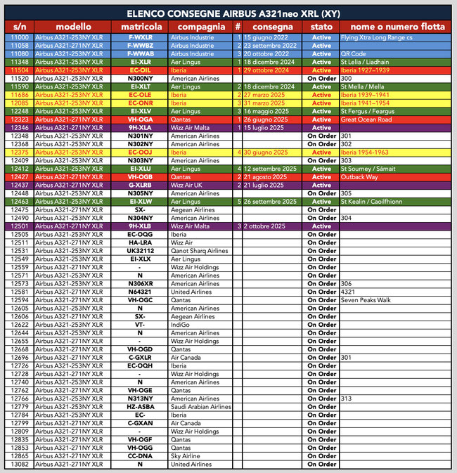Qui di seguito la scheda dell'avvistamento e la situazione a oggi delle consegne, già eseguite e prossime, dell'Airbus A321neo XRL.