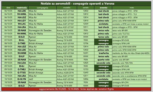 Da segnalare che oggi, lunedì 13 ottobre, è prevista la visita del Ryanair EI-ILH, consegnato alla compagnia irlandese lo scorso 22 settembre e entrato in servizio commerciale il 24 settembre che ha già comunque visitato il Catullo il 28.