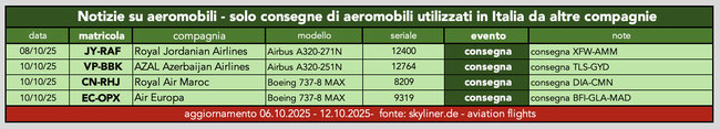 Una selezione delle consegne di aeromobili potenzialmente osservabili nel resto del nostro Paese.