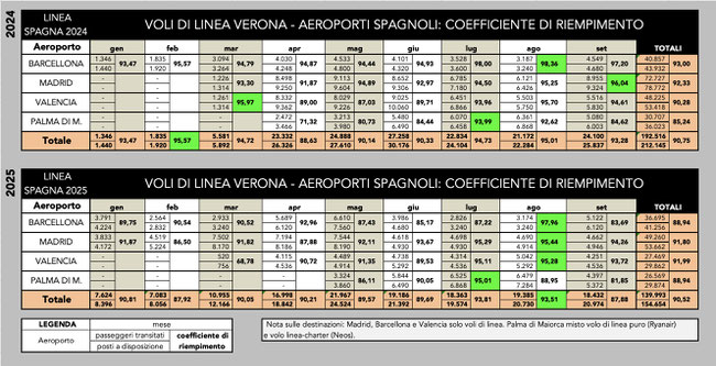 Anche per il mese di settembre si assiste a un calo del traffico passeggeri tra l'Aeroporto di Verona e la Spagna. Il dato puntuale mensile vede un calo da circa 34mila a circa 27mila passeggeri, pari a circa il 21%.